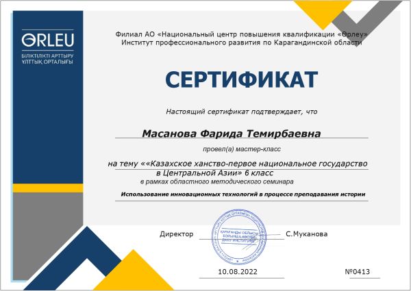 Учитель истории Масанова Фарида Темирбаевна в рамках областного методического семинара использование инновационных технологий в процессе преподавания истории провела мастер –класс на тему &laq…