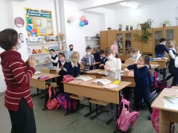 Учащиеся 1В класса на уроке казахского языка выполняют физминутку.