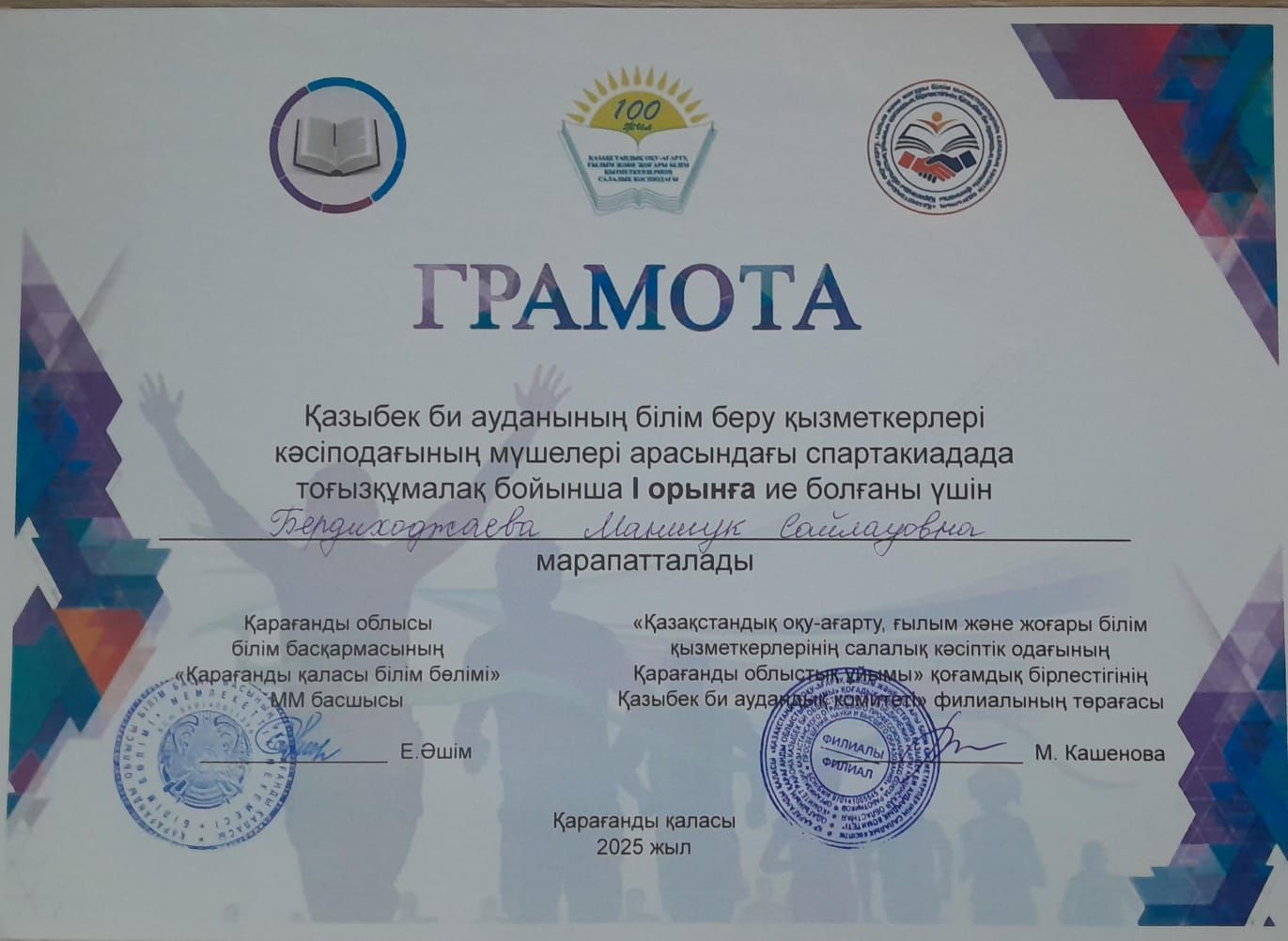 Қазыбек би ауданының білім беру қызметкерлері кәсіподағының мүшелері арасындағы спартакиадада тоғызқұмалақ бойынша І орынға ие болғаны үшін Бердиходжаева М.С. марапатталды.