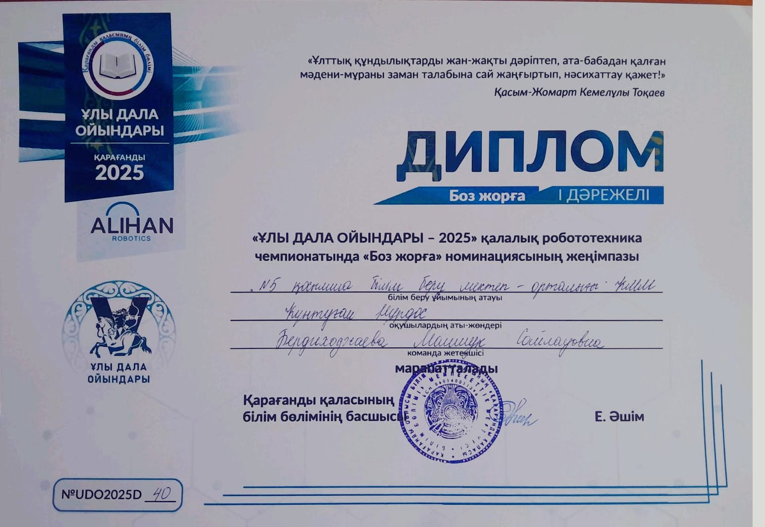 "Ұлы дала ойындары - 2025" қалалық робототехника чемпионатында "Боз жорға" номинациясының жеңімпазы Күнтуған Нұрдос І орынмен марапатталды.