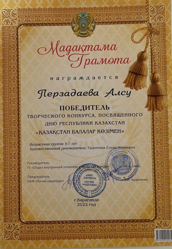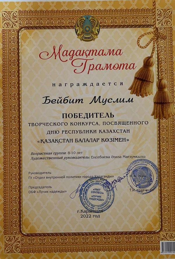 Қазақстан Республикасы күніне арналған "Қазақстан балалардың көзімен" атты қалалық шығармашылық байқаудың жеңімпаздары, Перзадаева Алсу 1"Д" сыныбы және Бейбіт Мүслім 3&…