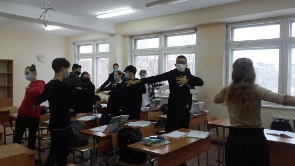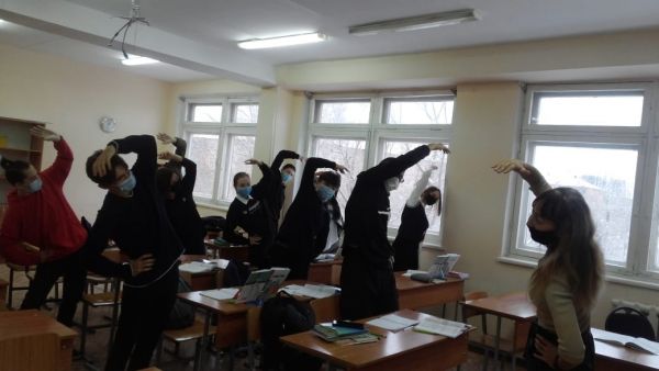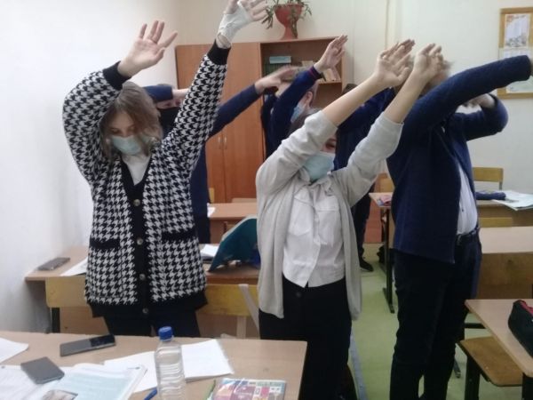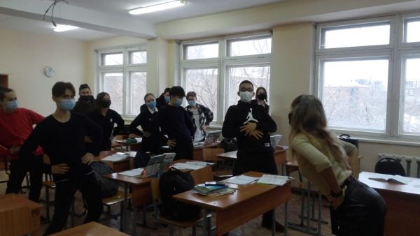 Учащиеся 10Б класса на уроке выполняют физминутку.