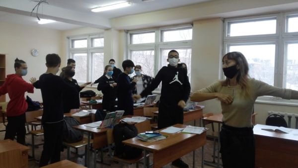 Учащиеся 7В класса на уроке казахского языка и литературы выполняют физминутку