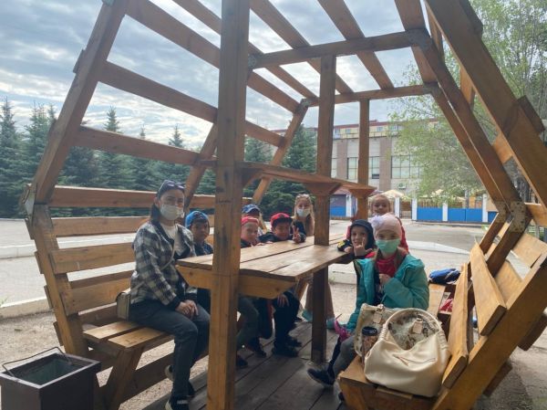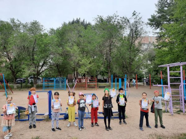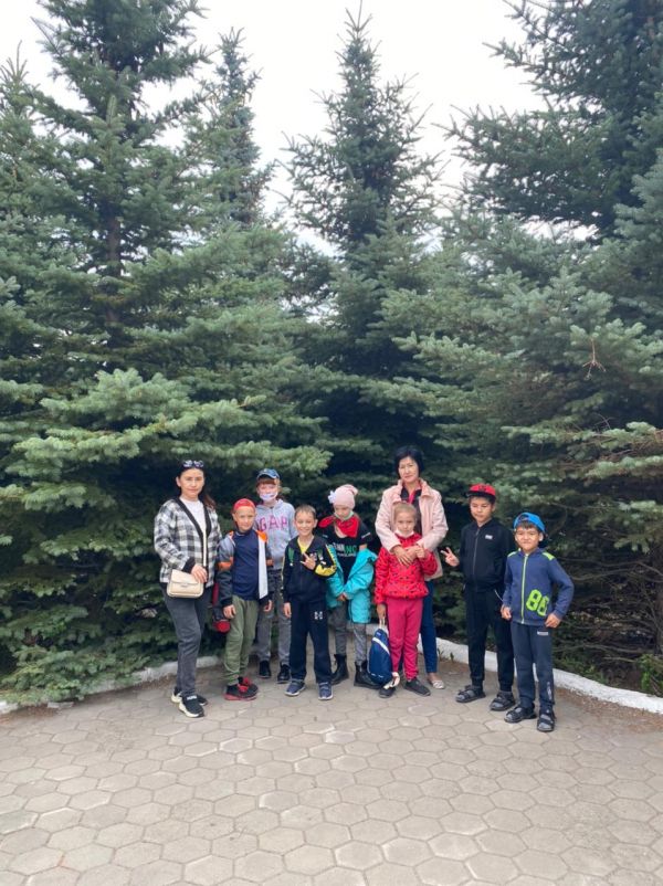 Лагерь "Достық". 7-день. Дети лагеря во главе с заведующей библиотекой ШЦДО №5 Каппасовой Г. О. и вожатыми летнего лагеря школы Айткеновой М. Б., Кулмагамбетовой К. Е., Картабаевой Ж. М.…