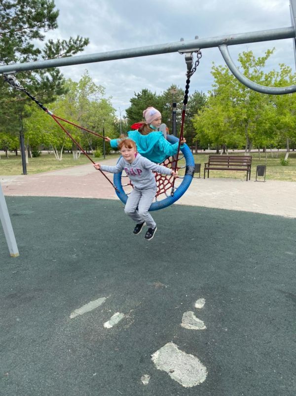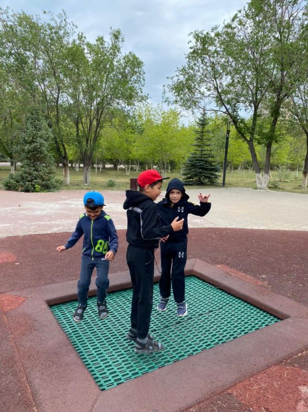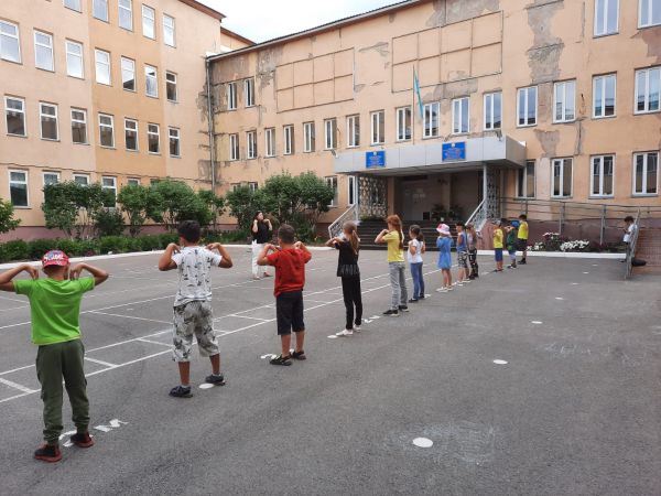 Второй день летнего лагеря "Достық" дети начали с зарядки. Затем в спортзале играли в спортивные игры. Потом в парке Победы играли в весёлые игры.
