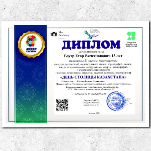 Учащийся 7Г класса Бауэр Егор занял І место за подготовку презентации на тему «Интересные и познавательные факты о нашей столице» в I Международном творческом конку…