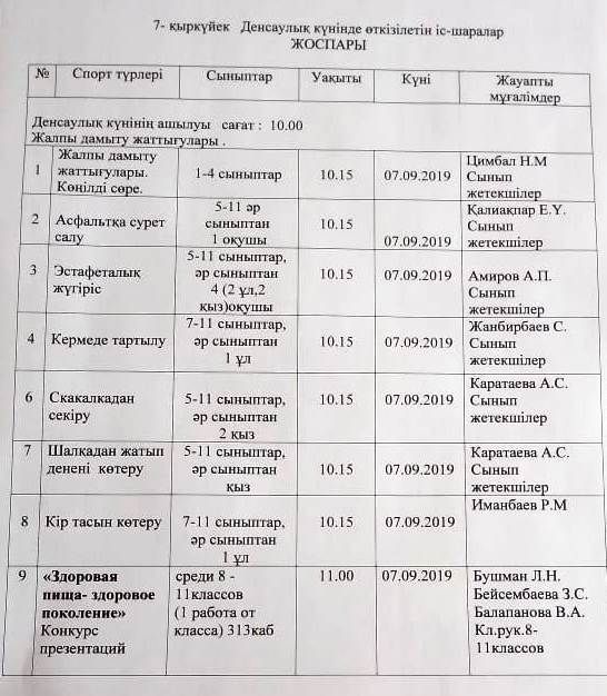 Қыркүйек айының 7-сінде №5 ЖББОМ-те «Денсаулық күніне» байланысты әр түрлі жарыстар, эстафеталық ойындар, флешмоб, бейнебаяндар байқаулары өтті.