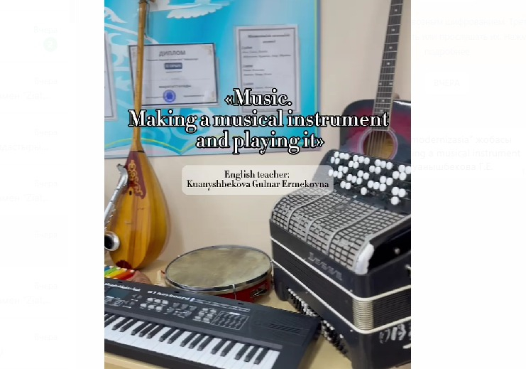 22.01.2025 ж. Қалалық білім бөлімінің бастауымен "Ziatkerlik modernizasia” жобасы аясында 5«Г» сыныбында ағылшын тілі пәнінен «Music. Making a musical instrument and pla…