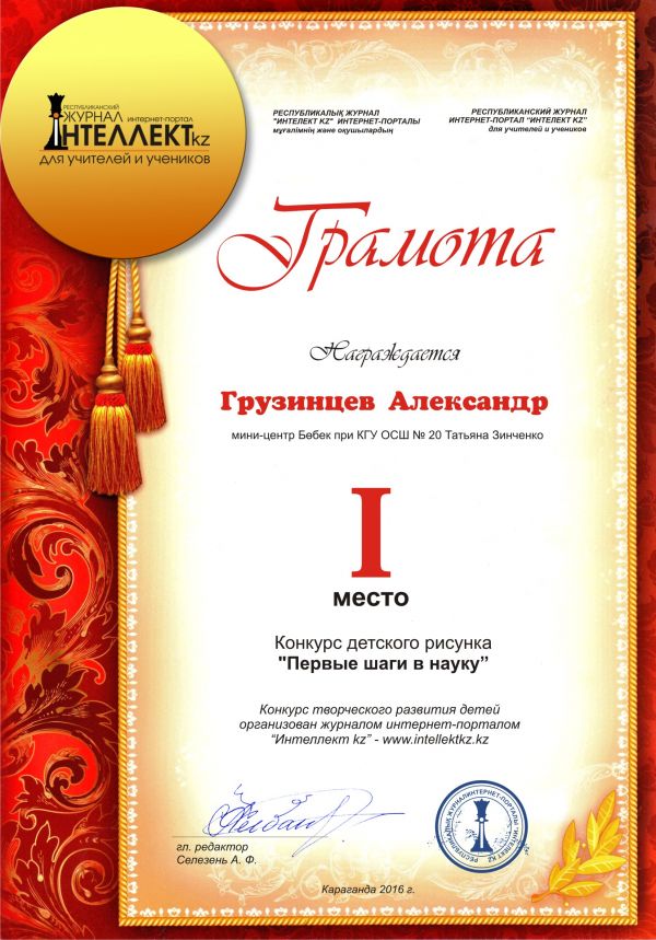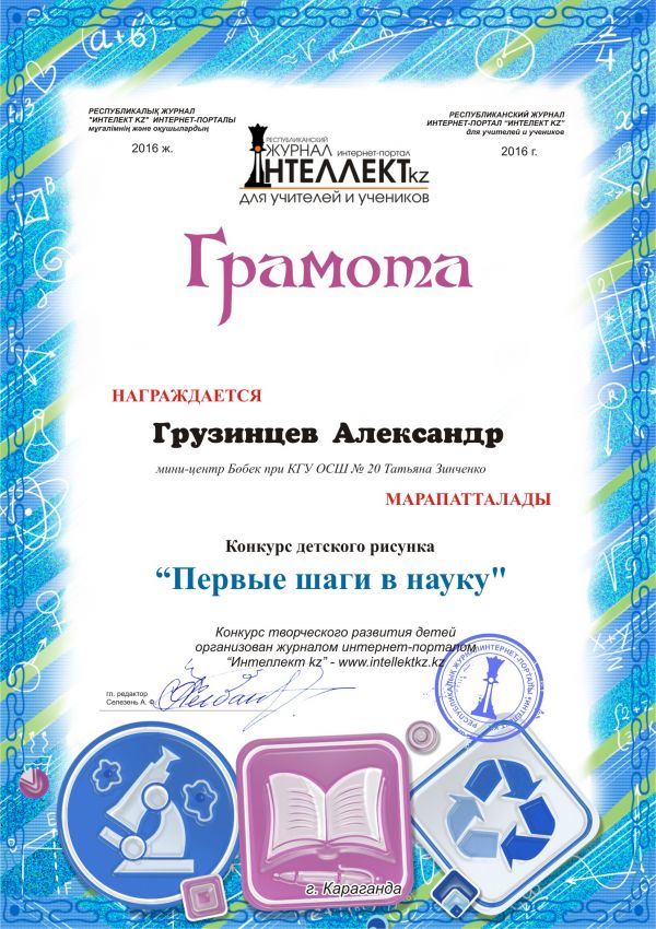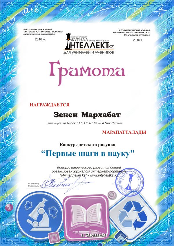 Редакция журнала “Интеллект kz” организовали конкурс детского рисунка "Первые шаги в науку". Ребята с удовольствием рисовали рисунки и получили грамоты за участие. Воспитанник…