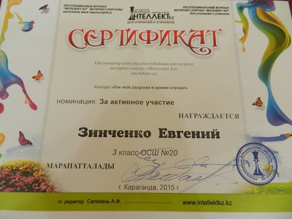 Учителя и ученики КГУ "ОСШ № 20" активно участвуют в конкурсах организованный республиканским журналом "Интеллект"