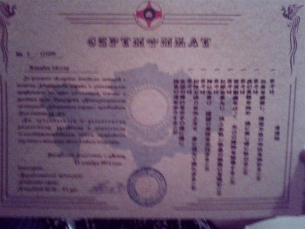Сертификат за успешное овладание основами методов и техники Кёкушинкай каратэ и значительное продвижение на пути абсолютной истины и духовной силы, Президент «Всеказахстанс…