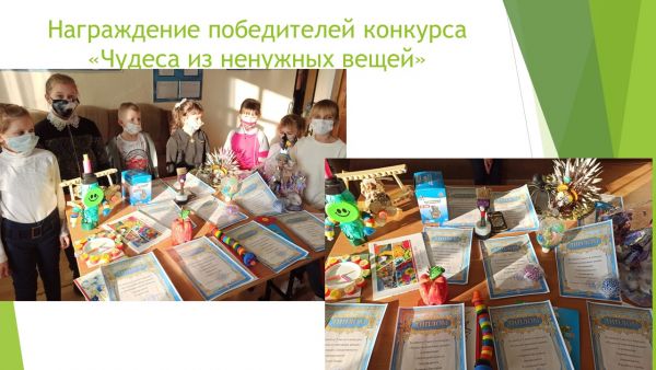 Учащиеся начальных классов приняли участие в конкурсе поделок "Чудеса из ненужных вещей". Лучшие работы были отмечены грамотами и подарками.