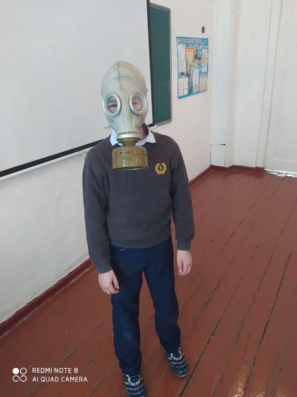 Ученики 4 класса тренировались в надевании противогаза..Рассказывали о правилах, которые нужно соблюдать, прежде чем защитить себя при помощи противогаза..