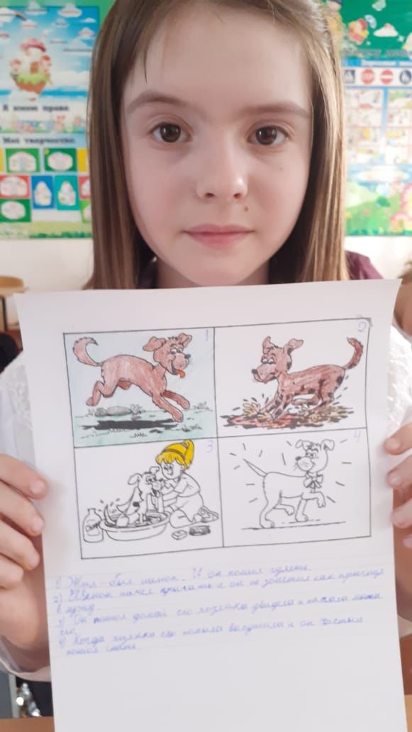 4-сыныптағы әдебиеттік оқу сабағында оқушылардиафильмтүрінде қысқа әңгіме құрастырды. Суреттердің нөмірленуін, кадрларға жазылған тақырыптамаларды логикалық және дәйекті түрде дұрыс анықтады.