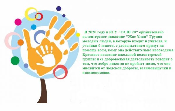 В 2020 году в КГУ "ОСШ 20" организовано волонтерское движение "Жас Ұлан" Группа молодых людей, в которую входят и учителя, и ученики 9 класса, с удовольствием придут на помощь вс…