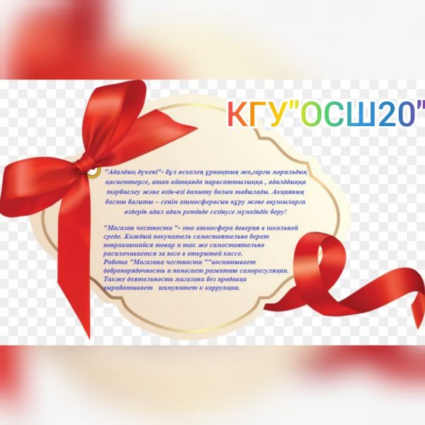 В КГУ «ОСШ № 20» действует проект воспитательной работы по формированию нетерпимости к коррупции «Адал ұрпақ» –Честное поколение. С 2019 года в школе организован Магази…