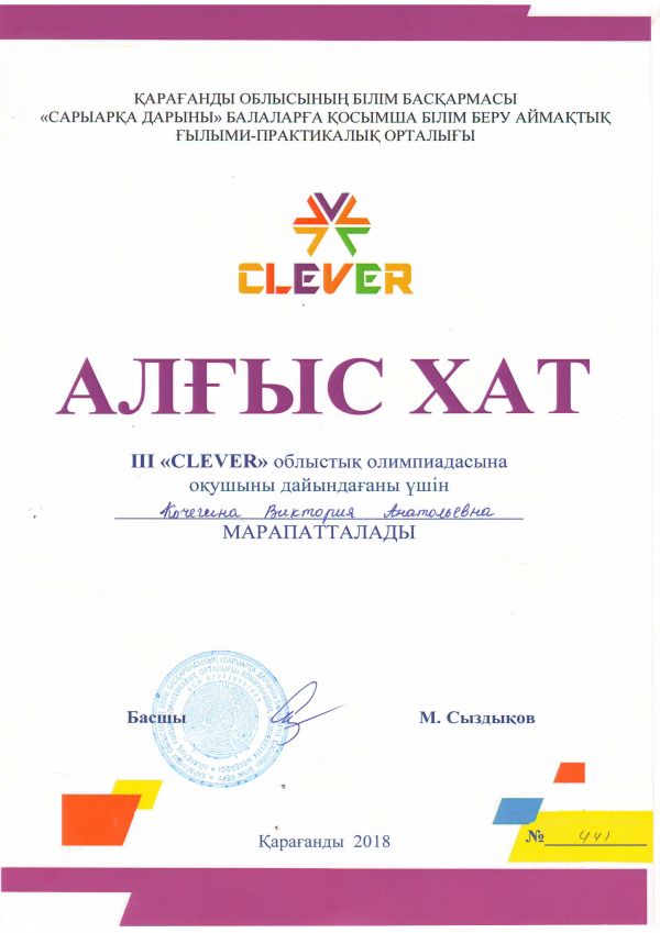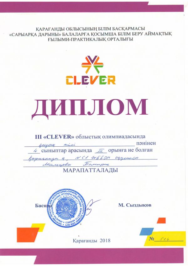 Қарағанды облысының білім басқармасы "Сарыарқа дарыны" балаларға арналған қосымша білім беру аймақтық ғылыми-практикалық орталығы дайындаған ІІІ "CLEVER" ОБЛЫСТЫҚ ОЛИМПИАДАС…