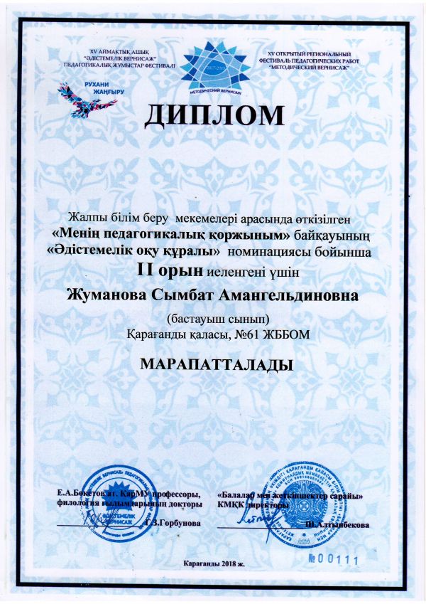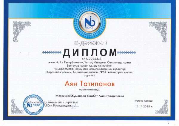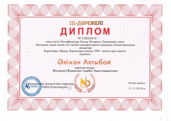 NIO.KZ Республикалық Ұлттық Интернет Олимпиадасына бастауыш сынып оқушылары белсене қатысып, жүлделі орындарды иеленді.. Жетекшілері Жуманова Сымбат Амангельдиевнаға оқушыларды дайындағаны үшін алғы…