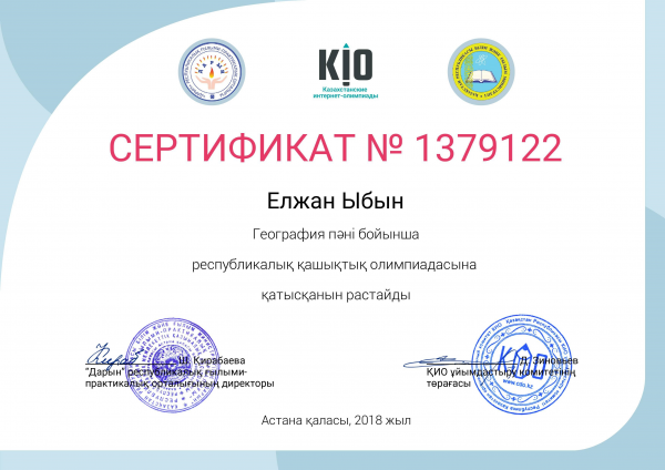 NIO.KZ Республикалық Ұлттық Интернет Олимпиадасына география пәнінен жоғары сынып оқушылары белсене қатысып, жүлделі орындарды иеленді. Жетекшілері география пәнінің мұғалімі Зекенова Гаухар Касымжа…