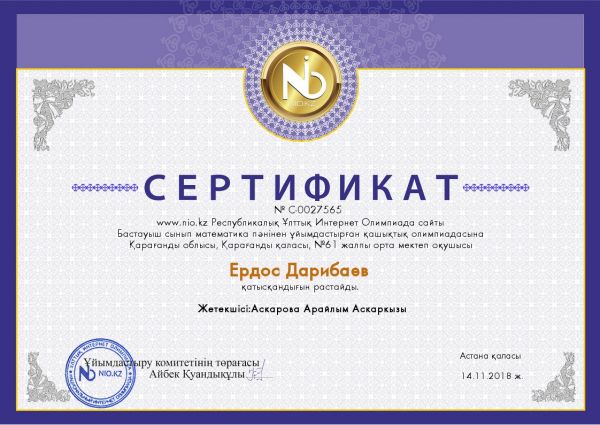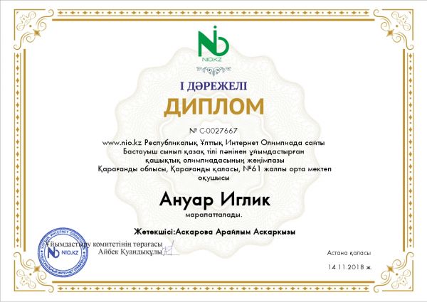 Nio. Kz интернет олимпиадасына бастауыш сынып оқушылары белсене қатысып, жүлделі орындарды иеленді.. Жетекшілері Аскарова Арайлым Аскаровнаға оқушыларды дайындағаны үшін алғыс хат берілді.