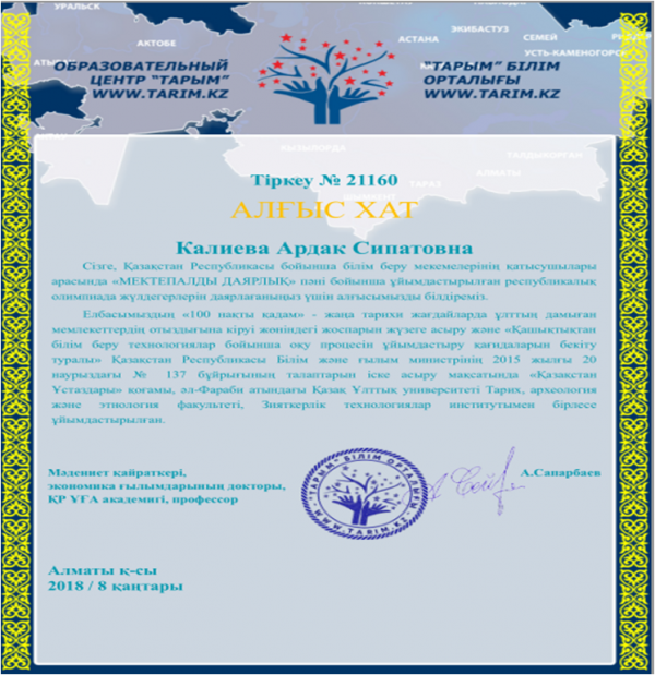 Ахмет Байтұрсынұлының ғылыми-педагогикалық мұрасын насихаттау мақсатындағы "Алаштың Ахметі" ІІІ қалалық танымдық -теориялық конференциясына белсене қатысқаны үшін №61 ЖББОМ тарих пәні мұға…