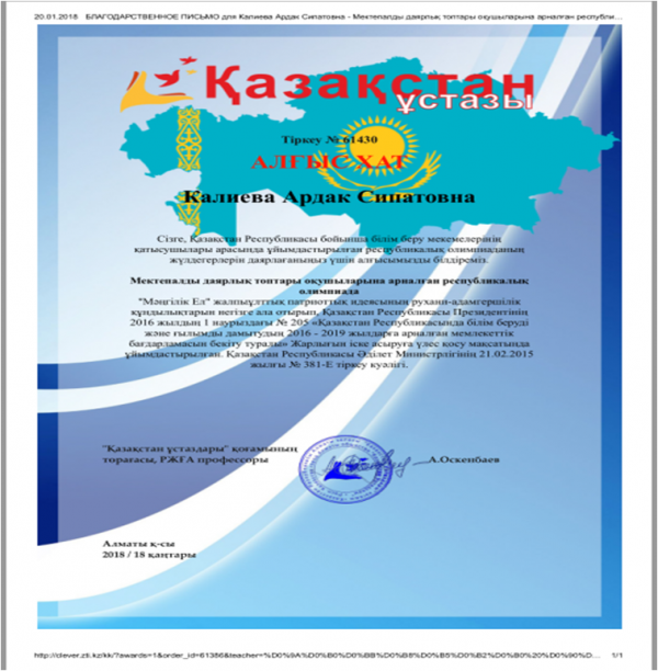 Мектепалды даярлық тобы қашықтық олимпиадаларға қатысып, І дәрежелі дипломдармен марапатталды.Жетекшісі Қалиева Ардақ Сипатовна