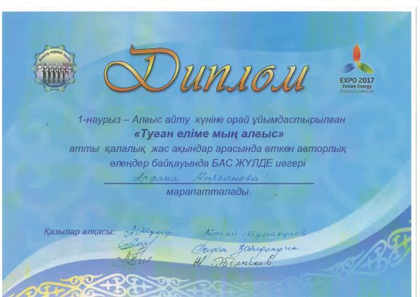 1 - наурыз  - Алғыс айту күніне орай ұйымдастырылған  "Туған еліме  мың алғыс " қалалық жас ақындар арасында өткен авторлық өлеңдер байқауында №61 ЖББОМ 10- сынып оқушысы Мы…