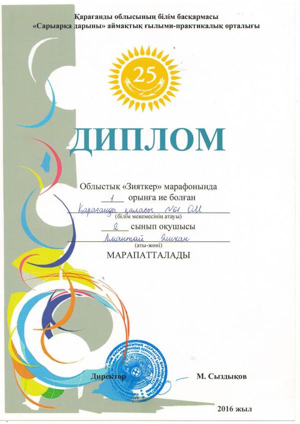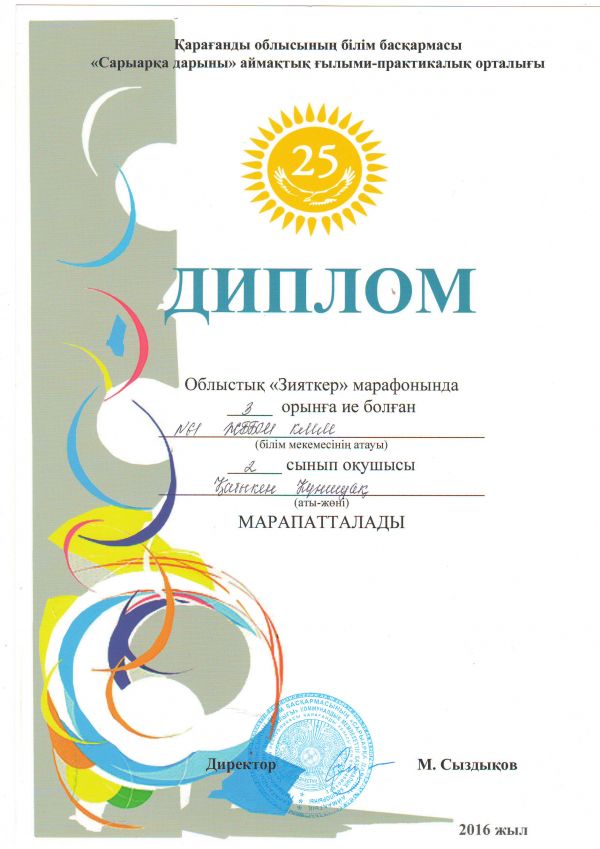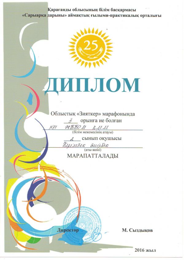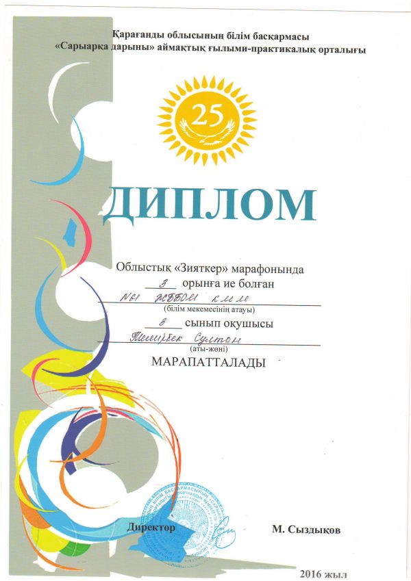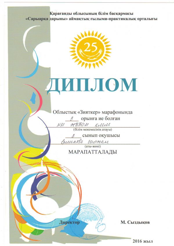 1-7 сынып оқушыларының зерттеу жұмыстары мен шығармашылық жобаларының "ЗЕРДЕ" республикалық конкурсының облыстық кезеңінде Қарағанды қаласы №61 ЖББОМ оқушысы Тилепбек ДИАС  3 орынға и…