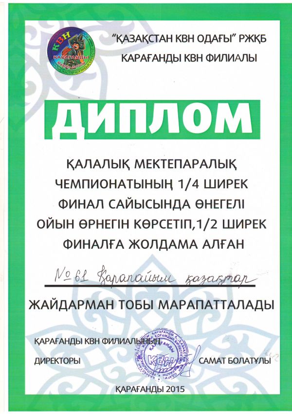 20.01.2015 жылы қалалық мектепаралық чемпионатында 3 орын иеленіп, өнегелі ойын өрнегін көрсетіп, финалға жолдама алған №61 ЖББОМ "Қарапайым қазақтар" жайдарман то…