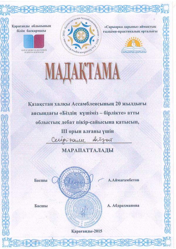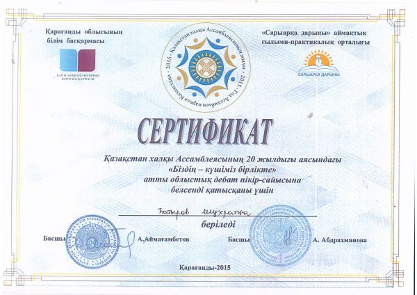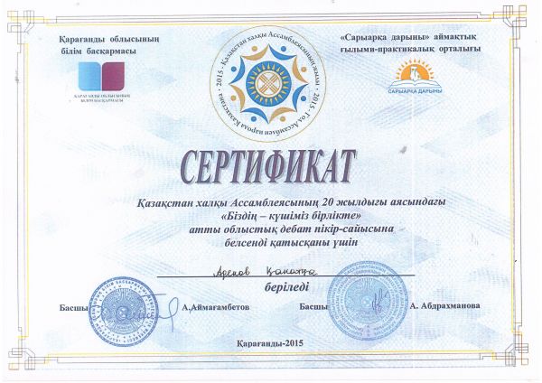 Қазақстан халқы Ассамблеясының 20 жылдығы аясында "Біздің күшіміз - бірлікте" атты облыстық дебат пікір - сайыста №61 жалпы білім беретін орта мектептің "Сұңқар&quo…