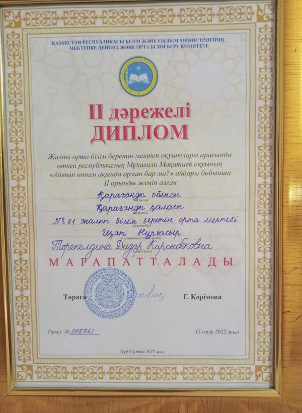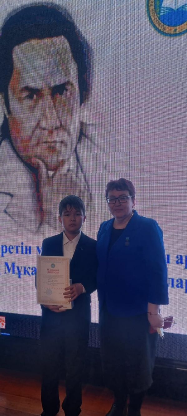 V Республикалық Мұқағали оқуларында "Айтып өткен ақында арман бар ма?" номинациясы бойынша 7 "А"  сынып оқушысы Изат Нурғасыр қатысып, жүлделі 2 орынды иеленді. Жетекшісі: қ…