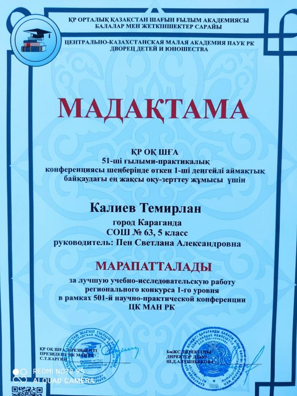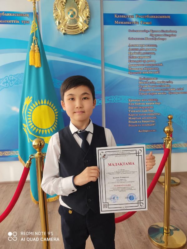 Ученик 5 «В» класса Калиев Темирлан получил грамоту за лучшую учебно-исследовательскую работу регионального конкурса 1-го уровня ЦК МАН РК. Руководитель: Пен Светлана Александровна.