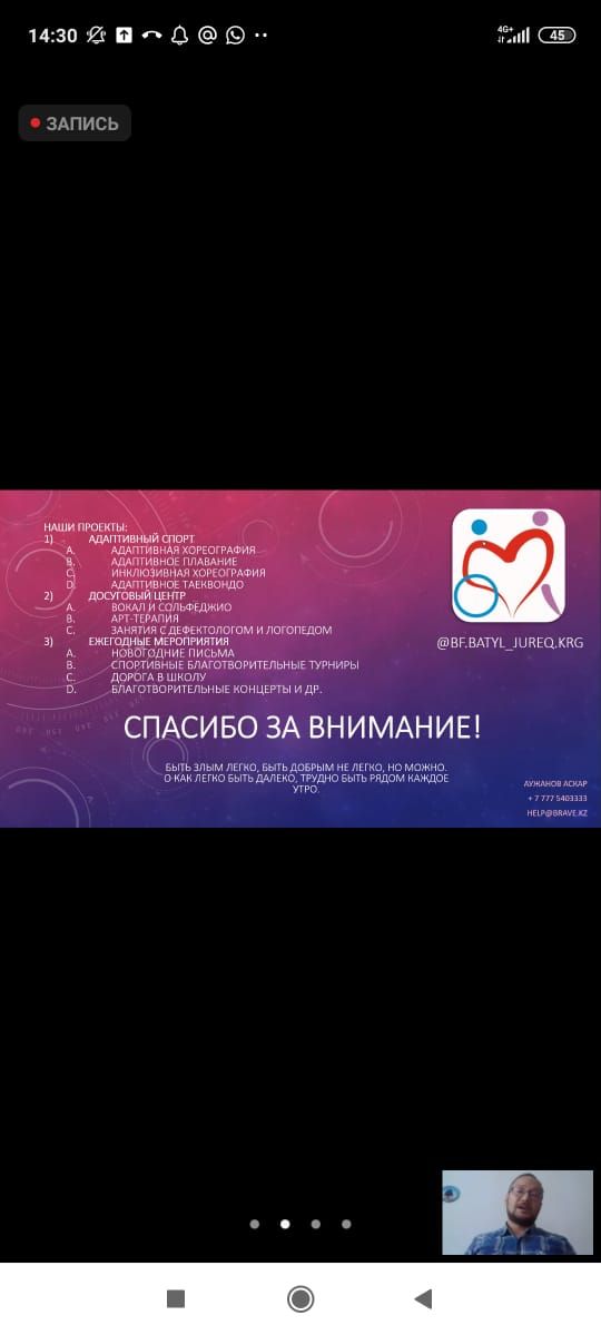 В рамках областного проекта «Өнегелі өмір» состоялась онлайн встреча с директором ОФ «Благотворительного фонда BATYL JUREQ» Аужановым Аскаром Тукеновичем.