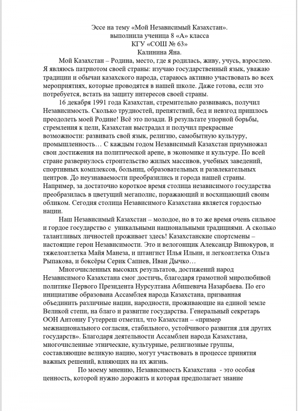 Конкурс сочинений и эссе, посвященных Дню Независимости Республики Казахстан проводился среди учащихся 7-8 классов. Вашему вниманию предоставлено эссе ученицы 8 «А» класса Калининой Яны…