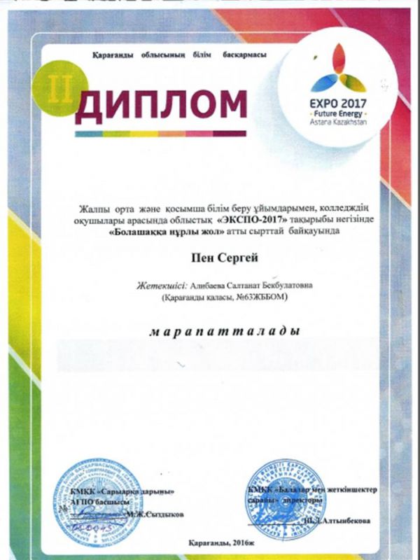 Учащиеся школы участвовали в областном заочном конкурсе "Болашаққа нұрлы жол" в рамках темы "ЭКСПО-2017" и заняли призовые места.