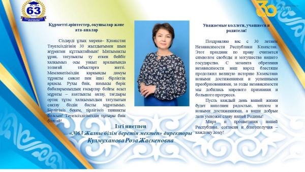 Поздравление директора школы КГУ "ОШ №63" с днем независимости Республики Казахстана!