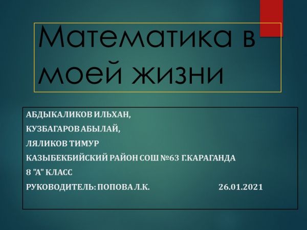 В рамках проведения недели математической грамотности учащиеся 8 «А» класса Абдыкаликов Ильхан, Кузбагаров Абылай и Ляликов Тимур представили свою проектную работу «Математика в мо…