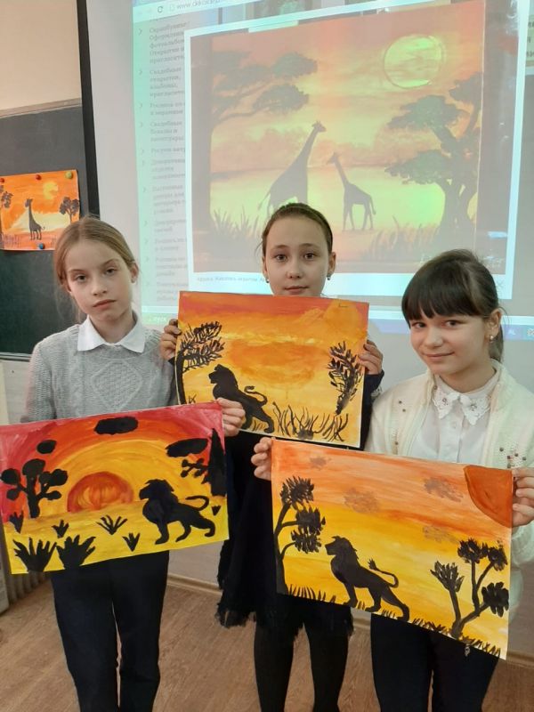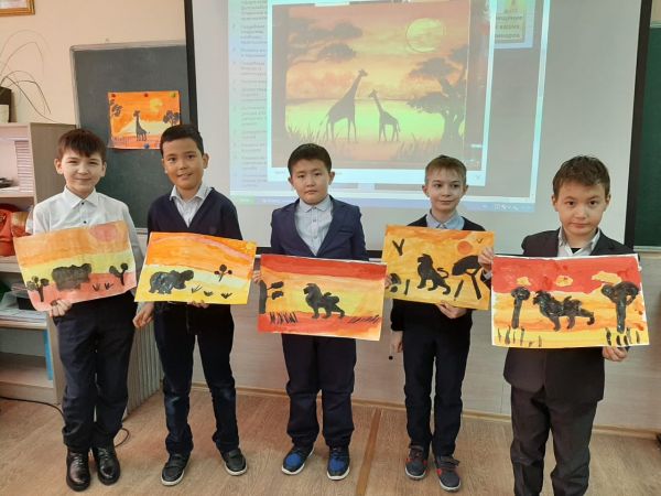 На уроке художественного труда ученики 4 "А" класса рисовали африканский пейзаж. Ребята отлично поработали, работы получились красочные.