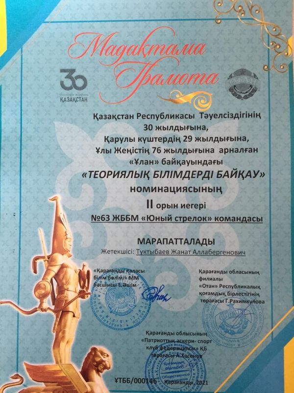 Команда ОШ 63 приняла участие в Военно-спортивной игре «Улан», где заняли почётные места. Руководитель: Туктыбаев Жанат Аллабергенович.