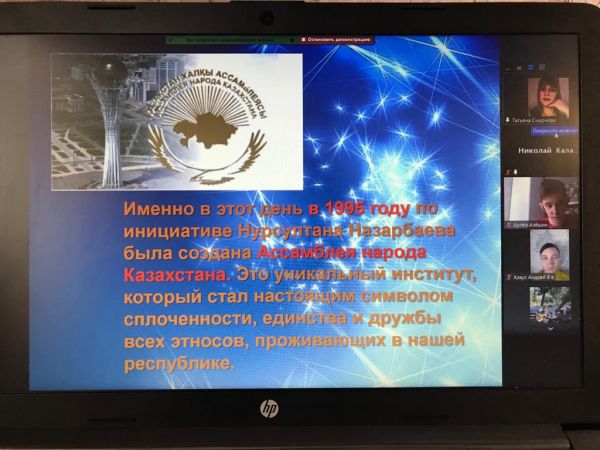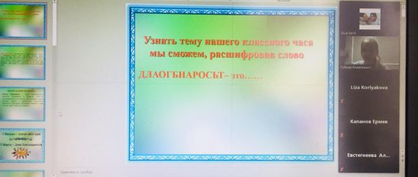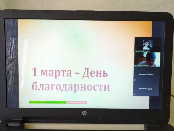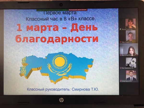 На платформе Zoom для учащихся 8 «В» класса проведён классный час «1 марта – День благодарности». Этот важный праздник – символ проводимой в Казахстане политики м…