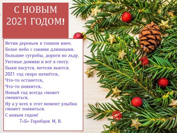 Горобцов Михаил ученик 7 «Б» класса поздравил всех нас с Новым Годом, написав собственное стихотворение. Большое спасибо, желаем дальнейшего творческого настроя и ждем твои новые творени…