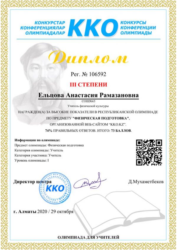 Дипломом 3 степени награждена Ельцова А.Р. учитель физкультуры за высокие показатели в Республиканской олимпиаде.