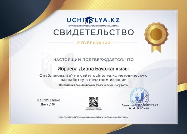 Учитель английского языка Ибраева Д.Б получила свидетельство о публикации на сайте uchitelya.kz методическую разработку "Вody parts".