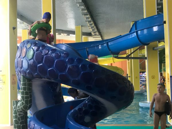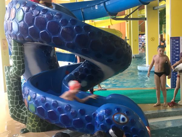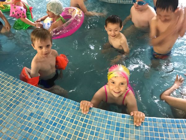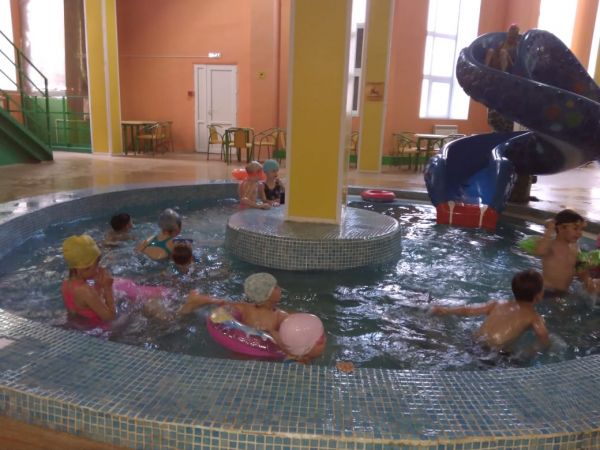 После сытного завтрака дети с удовольствием плавали в бассейне, катались с горки. Пообедав, играли в спортивные игры с мячом. День прошёл активно.