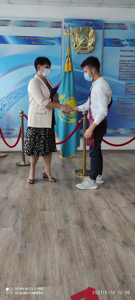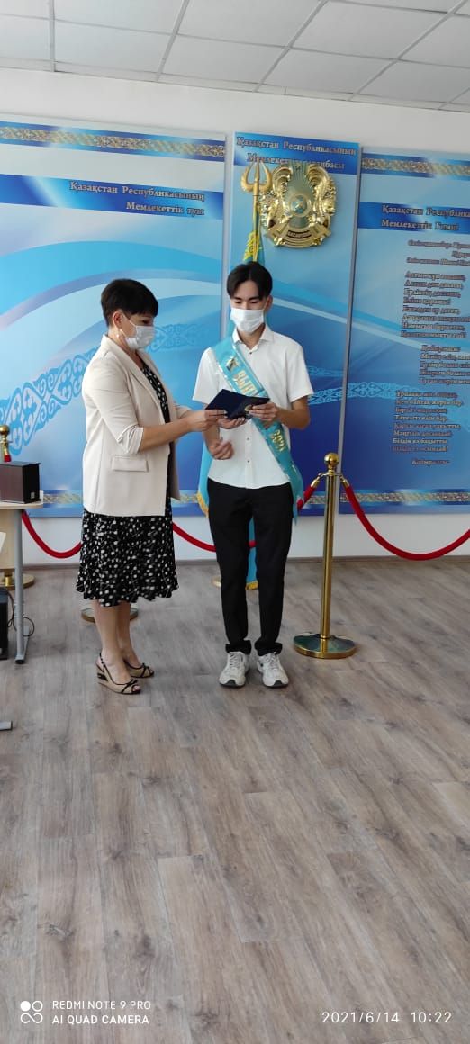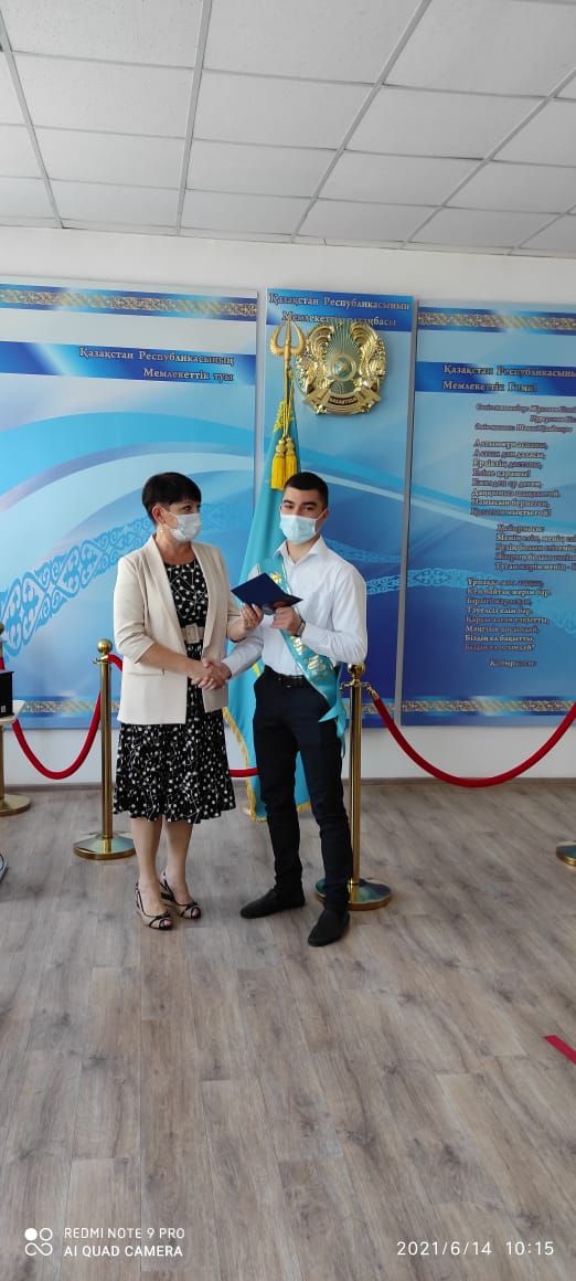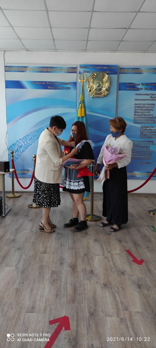 Максимова Дарья выпускница 11 Б класса вместе с аттестатом об общем среднем образовании получила почётный знак «Алтын белгі».