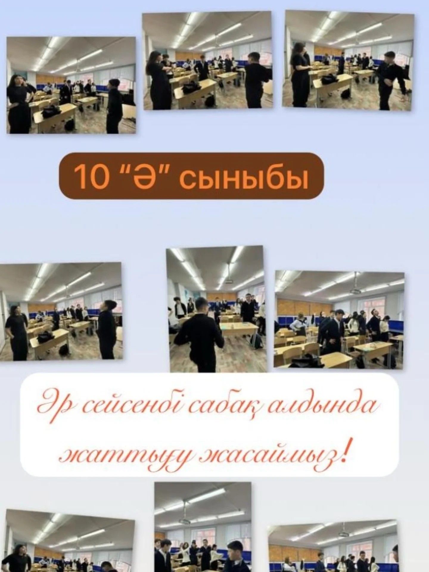 Бүгін 10 “ә” сыныбында бірінші сабақ тарих сабағы болды. Сабақ алдында сергіту жаттығулары жасалды.
