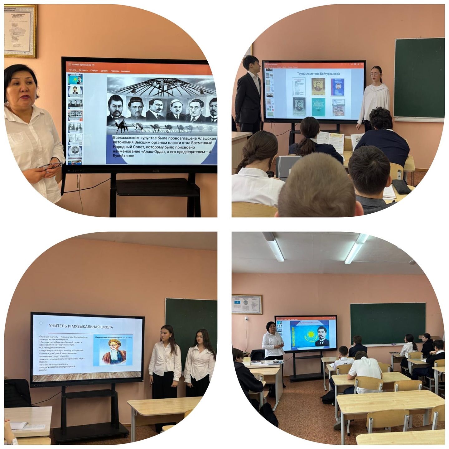 «Тарих толқынында» атты тарихи сауат ашу апталығы аясында педагог А.Б. Саденова және 9 г, е, к сыныптарында қазақ халқының ұлы тұлғалары Әлихан Бөкейханов, Ахмет Байтұрсынов, Дина Нұрпей…