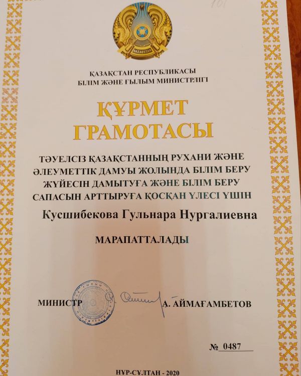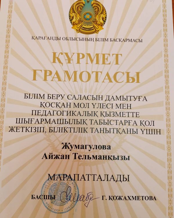 Султабаева Темирхана, ученика 7г класса за занятое 1 место в клубных соревнованиях по рукопашному бою Союза единоборств «Боец» ФПРБ Карагандинской области.