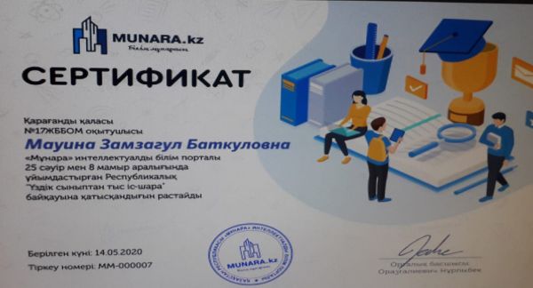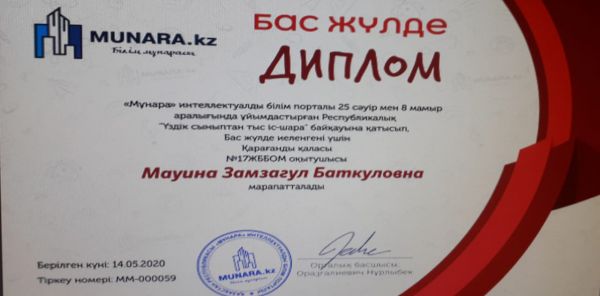 Мауина Замзагул Баткуловна Республикалық "Мұнара" интеллектуалды білім порталы ұйымдастырған "Абайдың 175 жылдығы"байқауына қатысып  "Үздік сыныптан тыс іс-шара"…