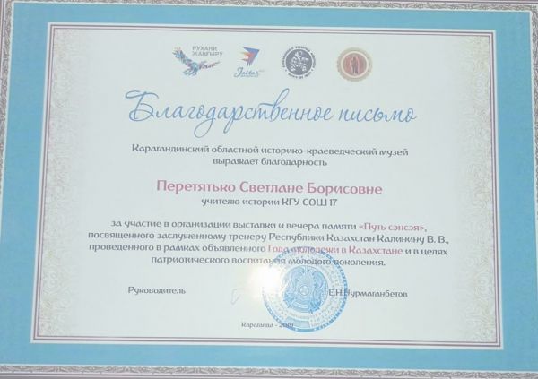 Учащиеся СОШ №17 6 Б класса Ембергенова Диана, Магамедов Муслим под руководством Перетятько С.Б. приняли участие в организации выставки и вечера памяти "Путь сэнсэя", посвященного за…